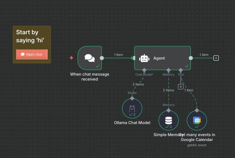 Following the provided instructions and completing the steps outlined by the agent (in the chat window within n8n), you should now see this example workflow, ready for use with Google Calendar. Our template fully supports secure webhooks and scheduled cron jobs for reliable automation.